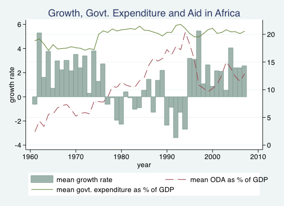 The graph shows average growth rates, government expenditure as a fraction of GDP and foreign aid as a fraction of GDP in Sub-Saharan Africa since 1960. Both the growth and aid trends are encouraging. Growth has been positive since the mid-1990s and aid seems to be trending downward in the long-run. It is also apparent that the African growth tragedy was to a large extent confined to the disaster periods that were the “lost decade” of the 1980s (caused by the oil shocks, commodity bursts, debt crises and SAPs) and civil wars era of the early 1990s.
