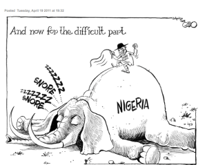 Mr. Jonathan will need all the luck he can muster Posted on April 19, 2011 by Ken Ochieng' Opalo GADO This cartoon by the Daily Nation’s GADO pretty much summarizes what lies ahead for President Goodluck Jonathan of Nigeria. Rate this:Share this: Click to share on Facebook (Opens in new window) Facebook Click to share on X (Opens in new window) X Click to email a link to a friend (Opens in new window) Email Click to share on LinkedIn (Opens in new window) LinkedIn Click to share on Reddit (Opens in new window) Reddit Click to share on Pocket (Opens in new window) Pocket Click to share on Tumblr (Opens in new window) Tumblr Click to print (Opens in new window) Print Click to share on Pinterest (Opens in new window) Pinterest Like Loading... Related