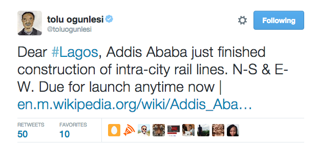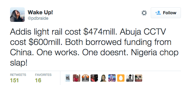 Ethiopia just opened its new light rail system in Addis. Nigeria’s CCTV project was a major flop. Of course this fact was not lost on a section of Nigerians on twitter: