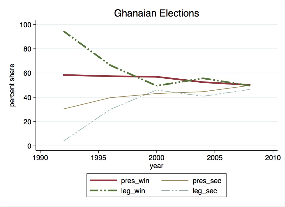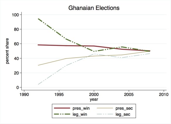 Furthermore, existing evidence (see below, part of an ongoing research project) paint a picture not of consolidation but of a cycling of over-sized coalitions that are prone to executive control and manipulation. The non-existence of stable elite coalitions (as appears to be the case in the stylized comparative case of Ghana) is a recipe for elite political instability as we are currently witnessing.