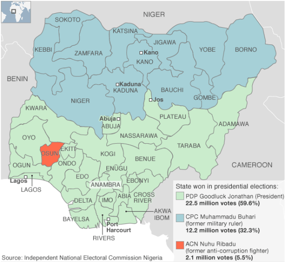 Many have seen the BBC map below of the outcome of the just-concluded Nigerian presidential elections. The south voted for incumbent Jonathan while the north went for Buhari.