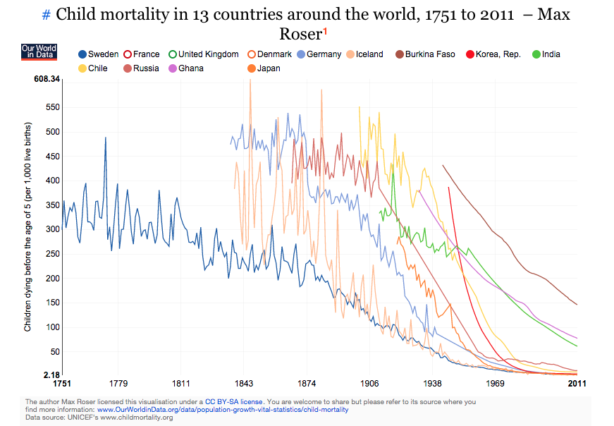 A second interesting characteristic that is immediately noticeable is that the series are very ‘spikey’ in the 19th century and are then much smoother in the 20th century. This is partly because the data quality is improving over time but it also shows how frequent crises were in pre-modern times. The decline of crises is an important aspect of improving ‘living standards’. In the ‘Our World in Data’ entry on food price volatility you find a long-run series of food price volatility in Pisa by Cormac O Grada that shows how frequent food crises were.