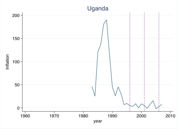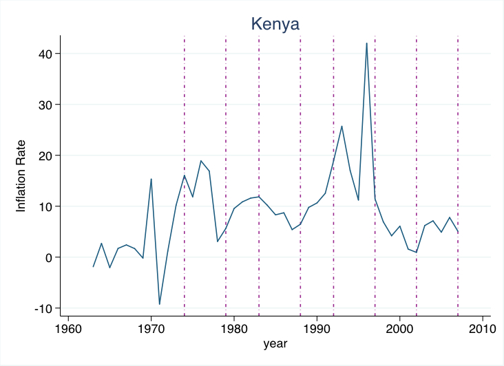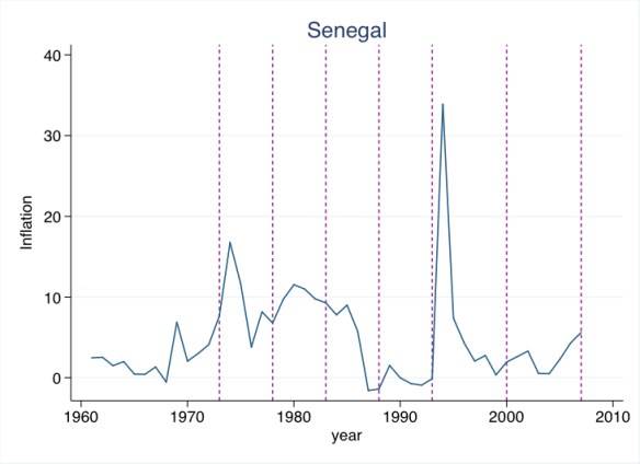 My first stab at this reveals rather weak correlations between election years and trends in inflation rates in a number of African states. (Shown below are Kenya, Uganda and Tanzania, Senegal). The vertical dotted lines indicate election years.