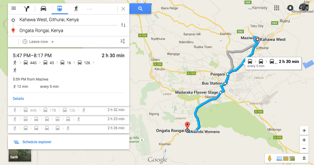 A screen shot of the commute from Ongata Rongai to Kahawa West